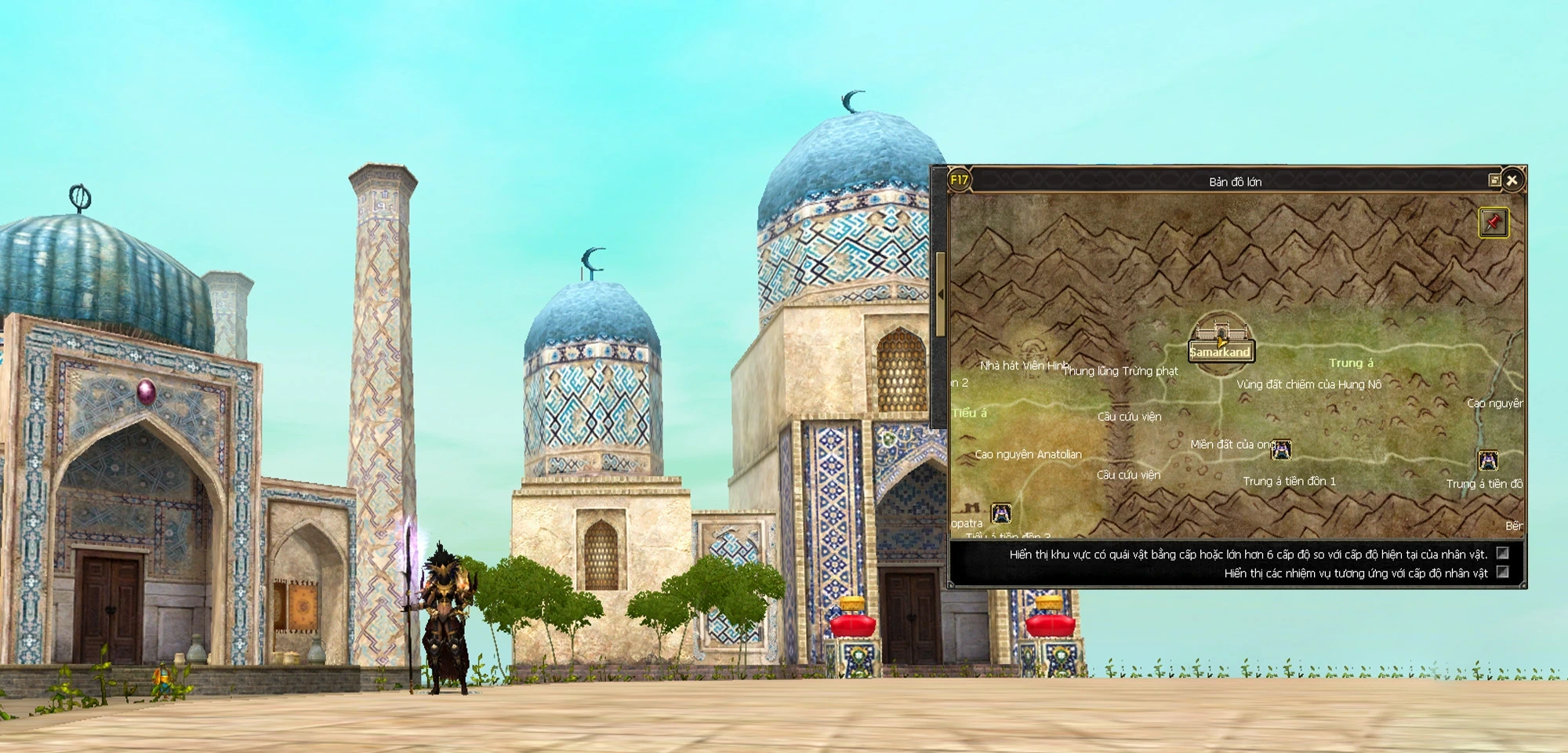 - Bản đồ chi tiết: Thành phố được thiết kế với các khu vực rõ ràng, bao gồm quảng trường trung tâm, pháo đài cổ kính và các cổng dẫn ra sa mạc hoặc núi non. Bản đồ trong game cho phép zoom chi tiết để tìm NPC, cửa hàng hoặc điểm hồi sinh. Ví dụ, bạn có thể đặt điểm hồi sinh tại "Viên đá phát sáng" ở Samarkand để tiện lợi khi luyện cấp hoặc tham gia sự kiện guild.